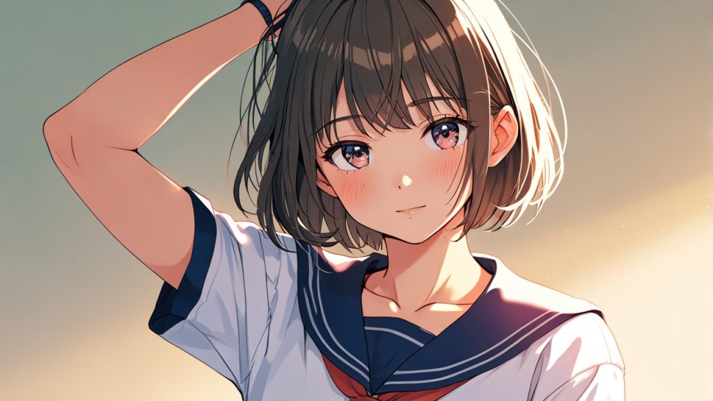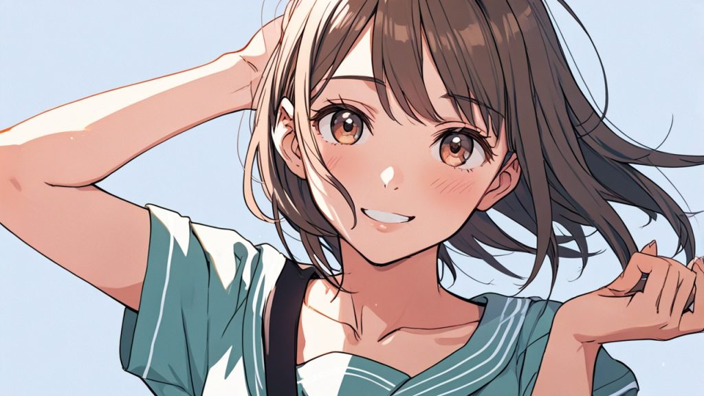 明るい夏空の下で見せる、自然体の微笑み。爽やかな風になびく髪と、柔らかくきらめく瞳が印象的な青春イラスト作品です。