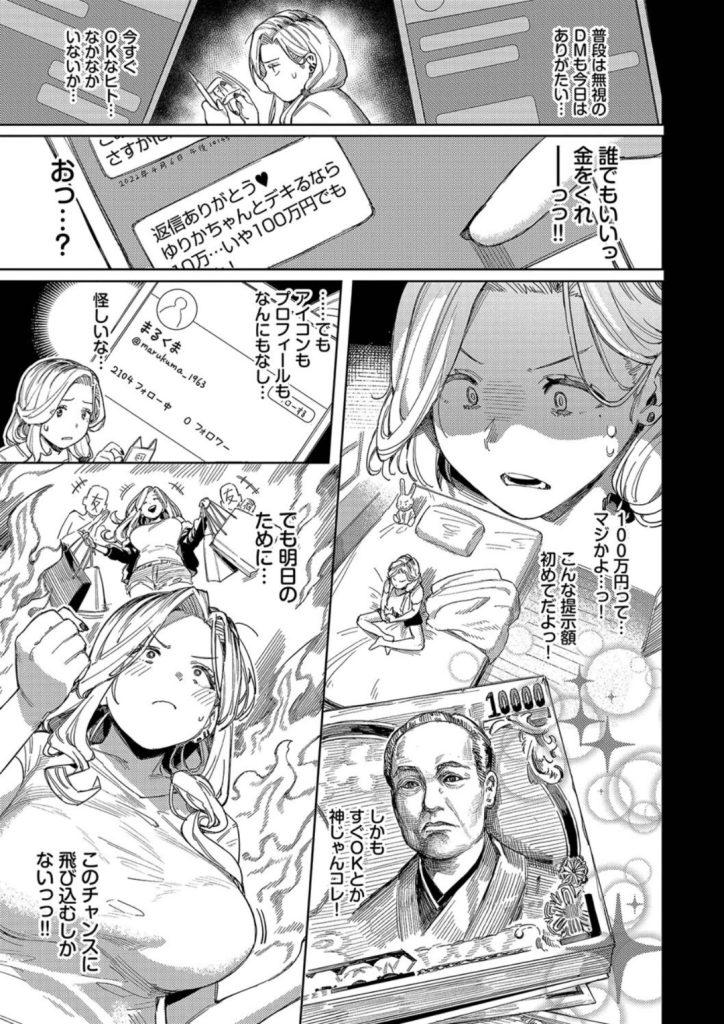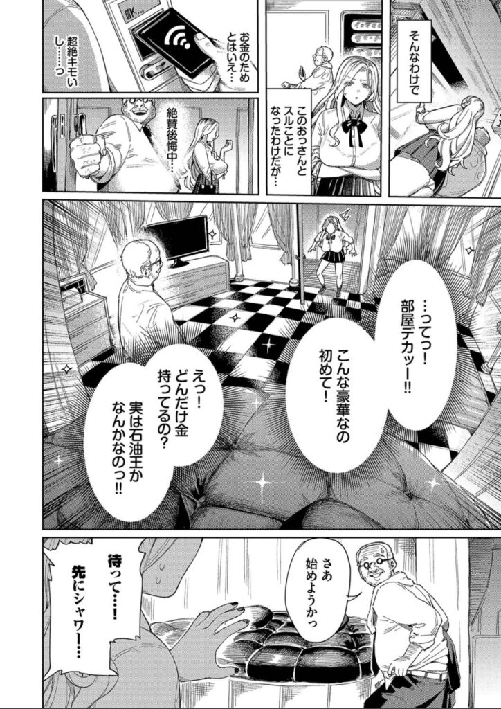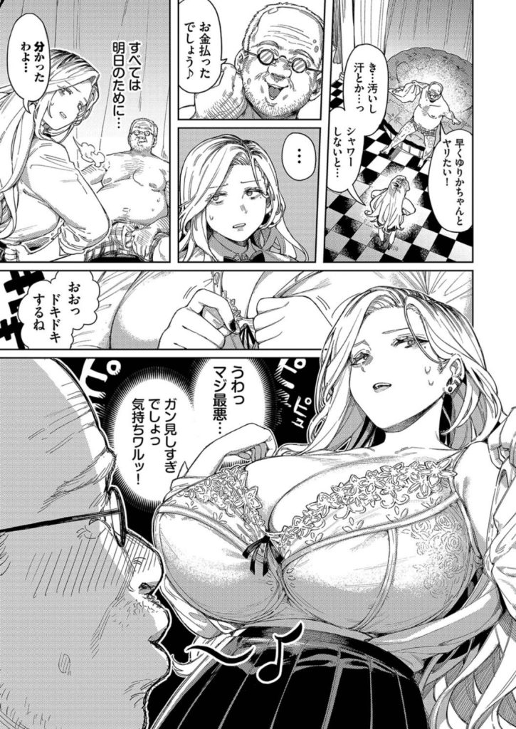 見栄っ張りなギャルJKのゆりかは、友人からショッピングに誘われるが手元にお金が足りない状況に陥る。 追い詰められた彼女はやむを得ず裏アカでの援交に手を出すが、そこで100万円という破格の条件を提示される。期待と不安を抱えて待ち合わせ場所に向かうと、そこに現れたのは汗だくで気持ち悪い中年男性だった。 強い拒絶感を抱きながらも金のために向かったホテルで、ゆりかはおじさんの圧倒的なテクニックと肉体に翻弄されることになる。 金と快楽の前になす術もなく、ナマイキだった乙女が絶頂の果てに心身ともに屈服していく「メス堕ち」の様子が描かれる。