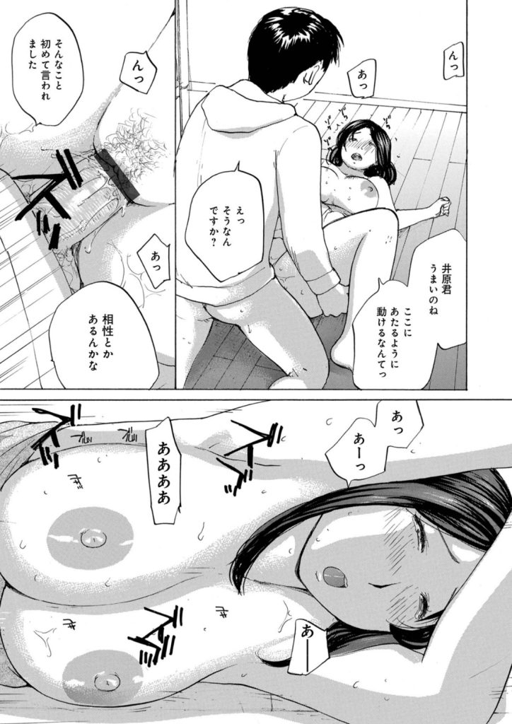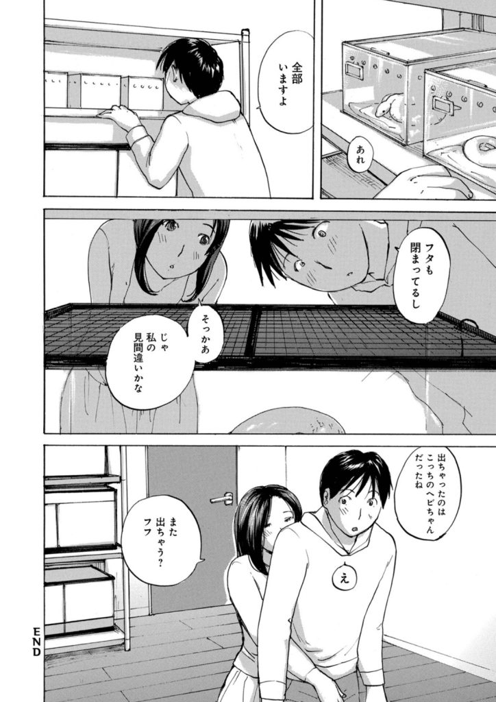 旦那の出張中、一人で留守番をしていた先輩の奥さんから自宅に呼び出された後輩の井原君。用件は、旦那の趣味であるヘビの世話を代わりにしてほしいというものだった。ヘビのために室温が高く設定された専用の部屋で、奥さんは「暑いから」と薄着になりノーブラのキャミソール姿で井原君に密着して誘惑を始める。暗い部屋で怖がる素振りを見せたり、井原君のヘビ(隠語)に興味を示したりと奥さんは積極的にセックスの誘いをかけてくる。最初は戸惑っていた井原君だったが、奥さんの執拗な「おねだり」と官能的な奉仕に抗えず旦那の留守宅で濃密な行為へと溺れていく―。
