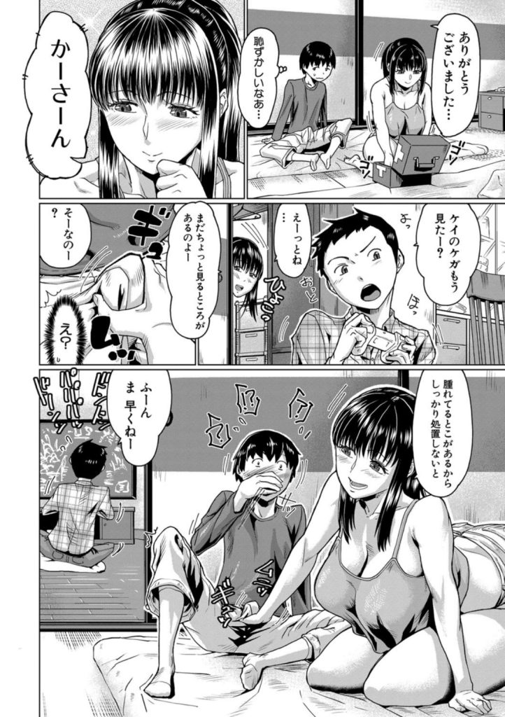 転んで膝を怪我した少年ケイは、友人であるヒロの家に立ち寄る。ヒロが隣の部屋でゲームに熱中する中ヒロの母親である百合子おばさんは、ケイを自室に招き入れて膝の手当てを始める。百合子おばさんの肉感的な体つきや治療中の至近距離での接触にケイは激しく興奮し、その様子はすぐに彼女の知るところとなる。百合子おばさんは「腫れているところがあるからしっかり処置しないと」と、治療を名目にしてケイの性器へ能動的にアプローチを開始。襖一枚隔てた先で友人が遊んでいるという状況下で百合子おばさんは口や手を使ってケイをリードしていく。最終的に彼女はケイを自身の中へと迎え入れ、友人に気づかれることのないまま彼の「筆おろし」を完遂させる―。