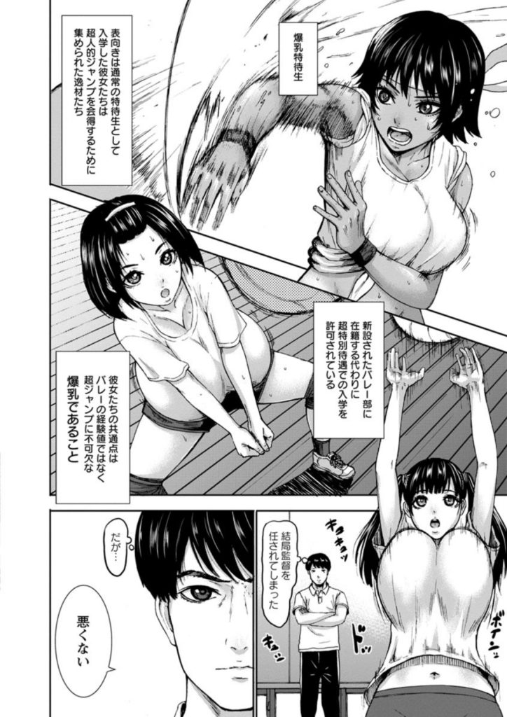 怪我によって卓球選手の道を断たれた桃田は、母校の学園長から新設された女子バレー部の監督に任命される。しかし、それは元バレー選手と間違えた学園長の完全な勘違いであった。さらに、その部活動の実態は学園長が提唱する「爆乳の弾力を利用した空中二段ジャンプ(爆乳跳躍計画)」を実現させるための実験場だった。集められたのは競技経験を問わず爆乳という共通点のみで選ばれた特待生たち。桃田は困惑しながらもキャプテンの犬山一子をはじめとする部員たちの真摯な姿勢と、揺れ動く巨大な胸に秘められた可能性に圧倒されていく。そんな中監督の視線が部員たちの胸に注がれていることを察した犬山は他の部員に手を出させないため、そして監督の性欲を解消させるため放課後の体育用具室で「キャプテンとしての性処理」を申し出る。元卓球選手の指導者と、奇想天外な理論を体現しようとする教え子の密やかな関係が幕を開ける。